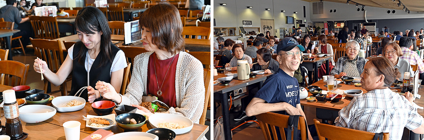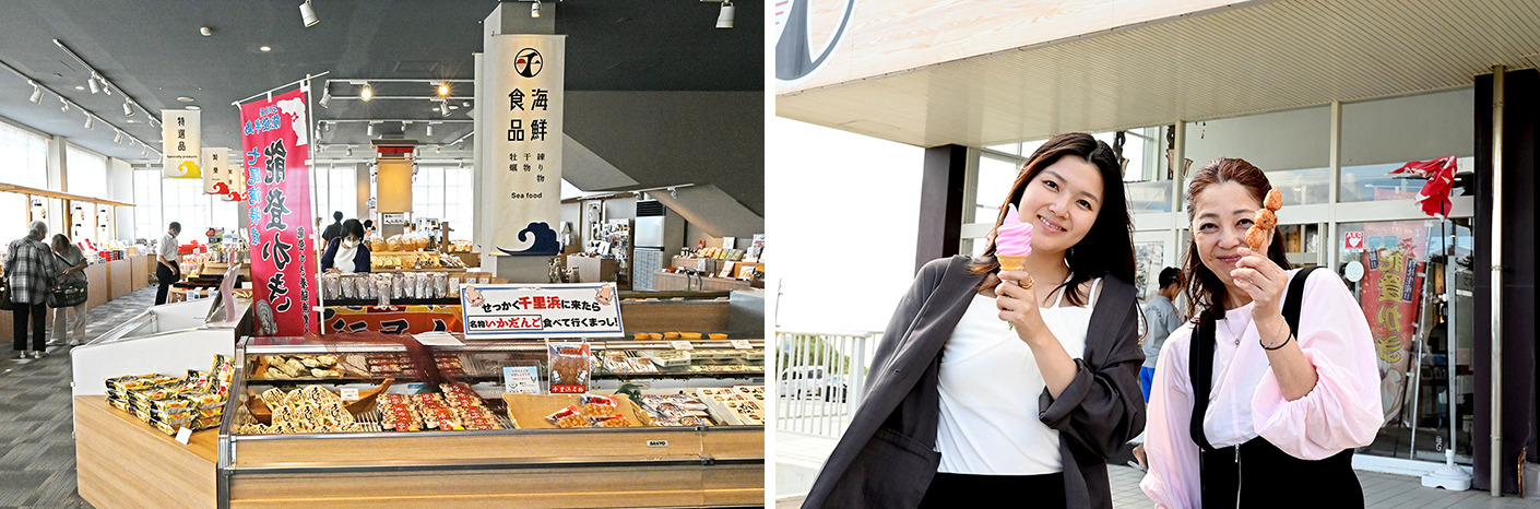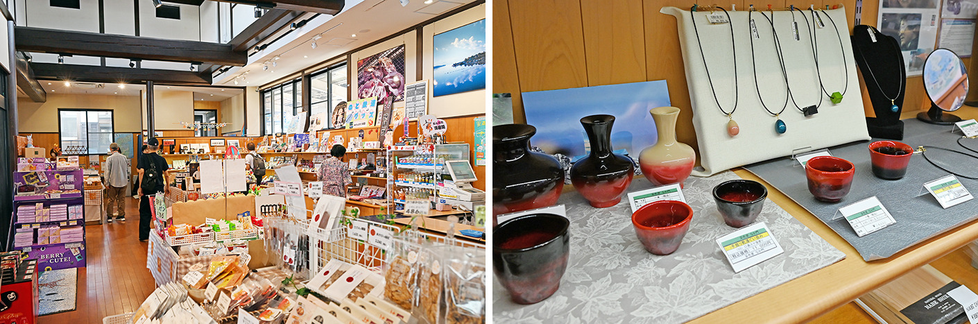 食後は自由時間。館内のお店でお土産を購入したり、ソフトクリームやイカ焼きを食べたり、カフェで海を眺めながら食後のコーヒーを楽しむこともできます。お土産コーナーには海産物や野菜、お菓子、いしる(魚醤)や塩、輪島塗や七尾の和ろうそくなど、能登ならではの品が並んでいました。