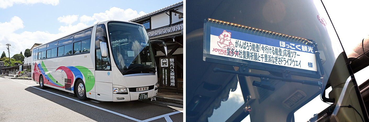 貸切バスに乗り換えて、次の目的地「千里浜」「氣多大社」がある羽咋市へ向かいます。乗車したのは能登町に本社がある「恋路観光」のバスで、席は指定席になっています。グループ参加の場合は隣同士や近くの席になります。