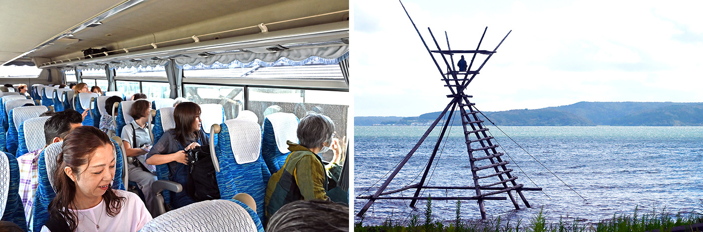 途中、穴水町の海辺のビュースポット「ボラ待ちやぐら」のそばも通ります。「ボラ待ちやぐら」は、江戸時代から伝わる日本最古の漁法で、観光用に復元されたものが沿岸に点在しています。道路の陥没、屋根瓦が落ちた家、崩れた建物など、道中には震災の爪痕がいくつも見られますが、この「ボラ待ちやぐら」は震災に耐えて以前の姿を留めていました。