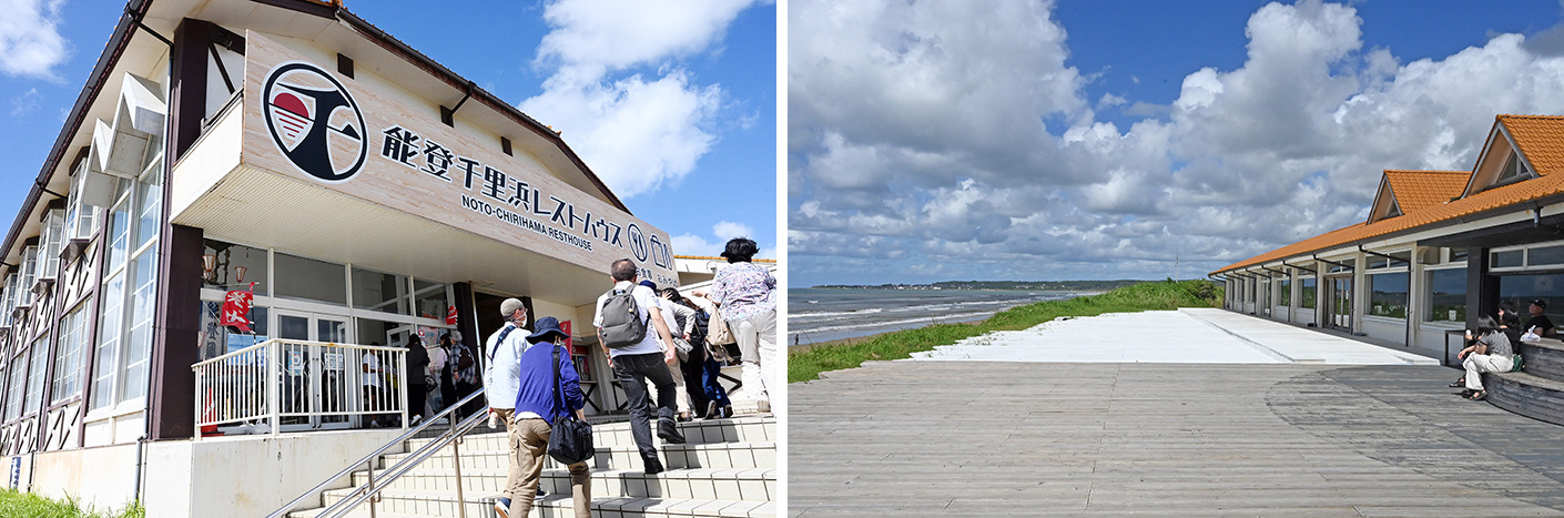 砂浜を車で走れる石川県有数の観光スポット「千里浜なぎさドライブウェイ」の終点にある「能登千里浜レストハウス」へ到着。2021年にリニューアルし、レストランや土産店に加えて、カフェやコワーキングスペースも新たにオープンした人気スポットです。砂浜に面した広いウッドデッキからは日本海を一望できます。