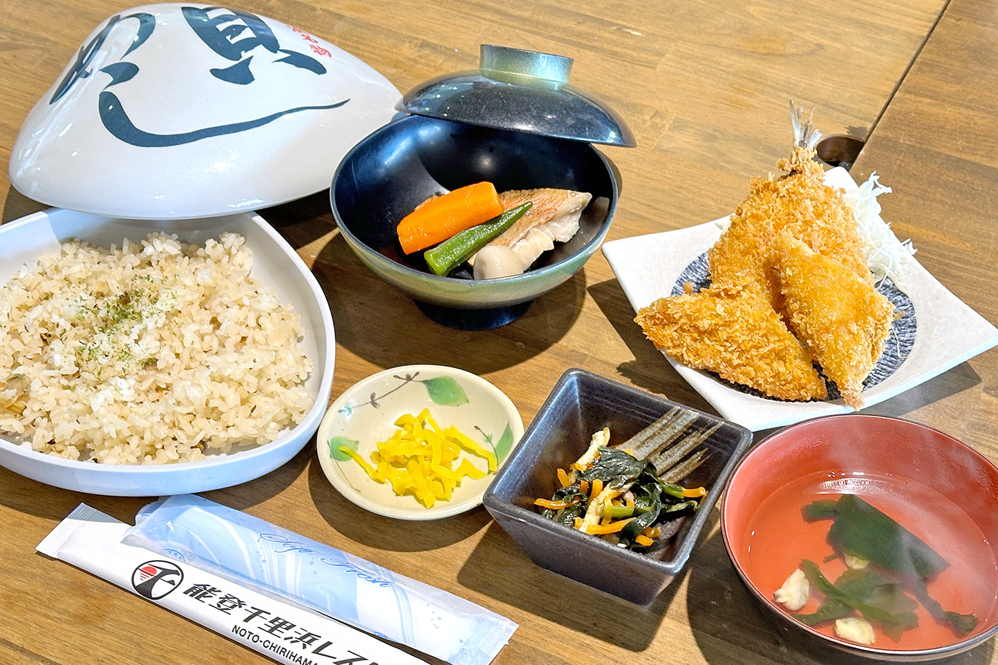 昼食は館内にある「浜焼き能登風土 千里浜店」で「千里浜定食」をいただきました。千里浜名物「貝めし」と、白身魚のフライ、煮物、小鉢、お吸い物と香の物がセットになっていてボリュームも満点。「貝めし」は、貝の形をした人の顔ほどもある大きな器に盛り付けられ、蓋を開けるとほんのり磯の香りが漂い、アサリを炊き込んだごはんは旨み・甘みが詰まっていました。