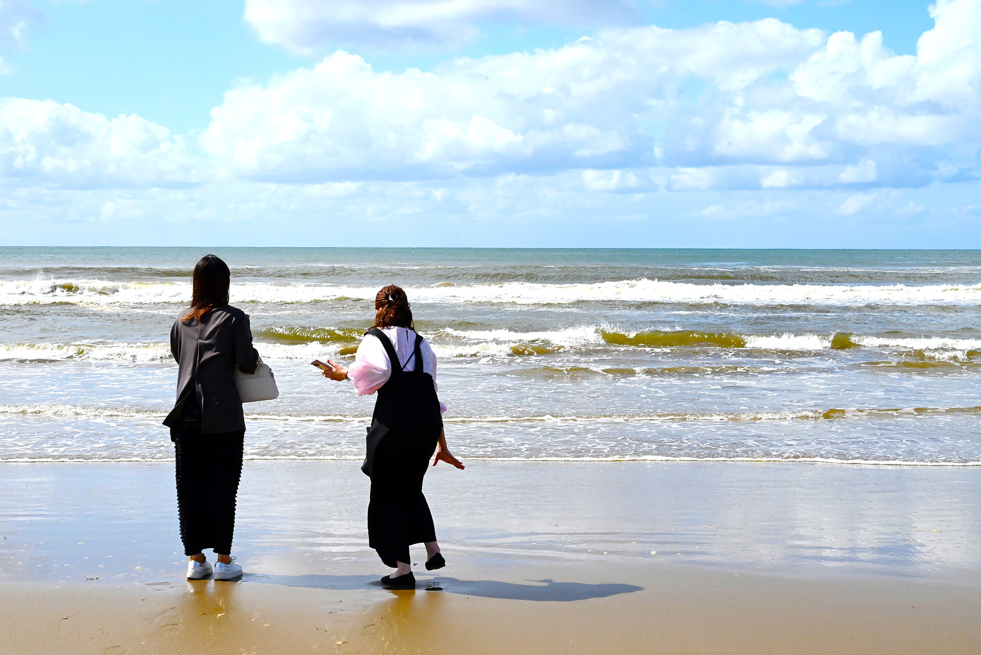 この日は前日までの天気の影響で、残念ながら「千里浜なぎさドライブウェイ」はバスで走行できませんでしたが、レストハウスから歩いて砂浜に下りることができたので、キラキラと輝く波打ち際をお散歩してきました。12月まで開催される今後のツアーでは、コンディションがよければ、日本で唯一の車で走れる「千里浜なぎさドライブウェイ」の醍醐味が体感できるはずです。