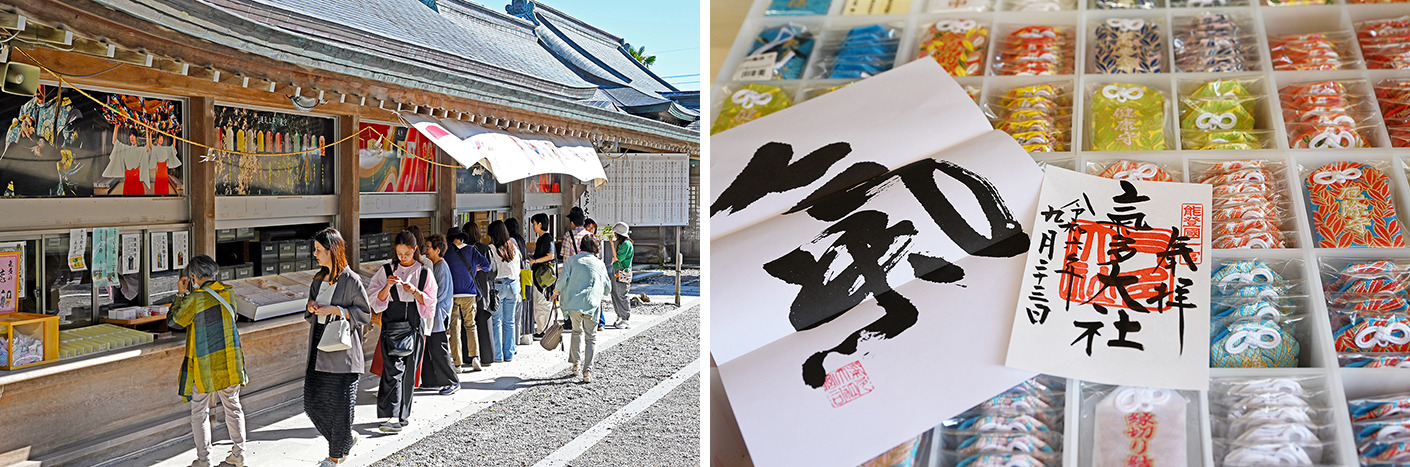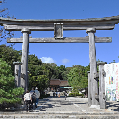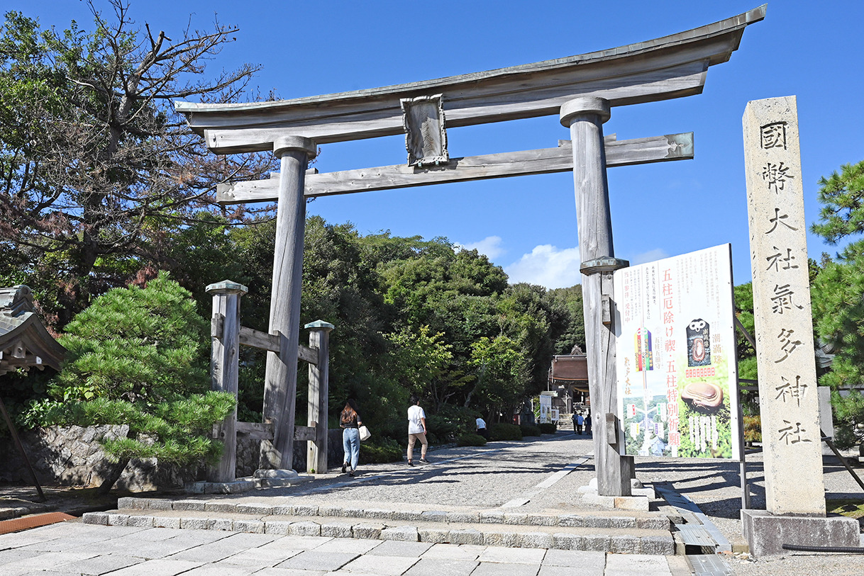 千里浜から約10分ほどで旅の最終目的地である能登國一宮「氣多大社」に到着。「氣多大社」は奈良に都があった時代から北陸の大社として朝廷からの尊崇も厚く、歴代の領主からも手厚く保護されてきた由緒ある神社です。その社名から「氣(き)」が多く集まる神社といわれ、御祭神の大己貴命(オオナムチノミコト/大国主命の青年期の名)は縁結びの神様であることから、縁結びスポットとしても有名です。