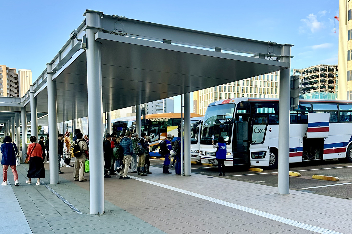 この日は3連休の初日で、団体バス乗降場には能登の復旧・復興支援に向かう石川県のボランティアバスが7時前から何台も並び、多くの人が乗り込んでいく様子を目にしました。