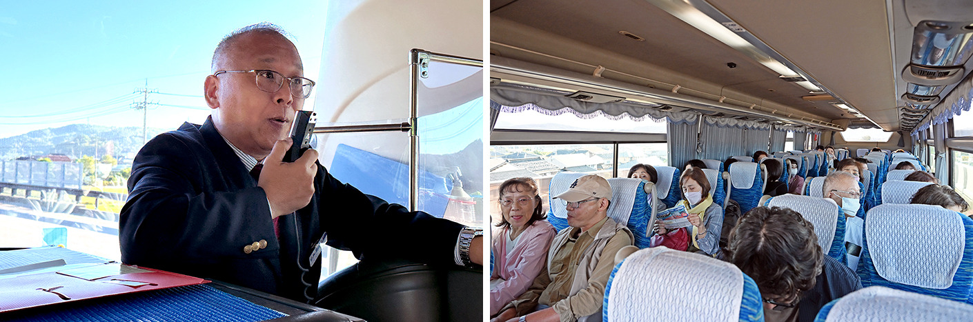車中では添乗員の山岸さんが、加賀市でも津波警報が発せられ高台へ避難したという自身の震災体験を話してくれたり、能登町に本社があり2次避難バスの運行にも関わった「恋路観光」のバスドライバー福島さんも、地震発生後の道路状況がどうだったか、迂回路や復旧の過程などを伝えてくれました。
