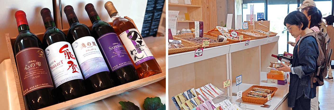 見学の後は建物1階にあるショップで、お待ちかねの試飲とショッピングの時間です。最初の1杯は「能登ワイン」を代表する能登産「ヤマソーヴィニヨン」で造った赤ワイン。山葡萄とカベルネ・ソーヴィニヨンを交配した品種で、しっかりとした味わいながら甘味も感じられる飲みやすいワインでした。