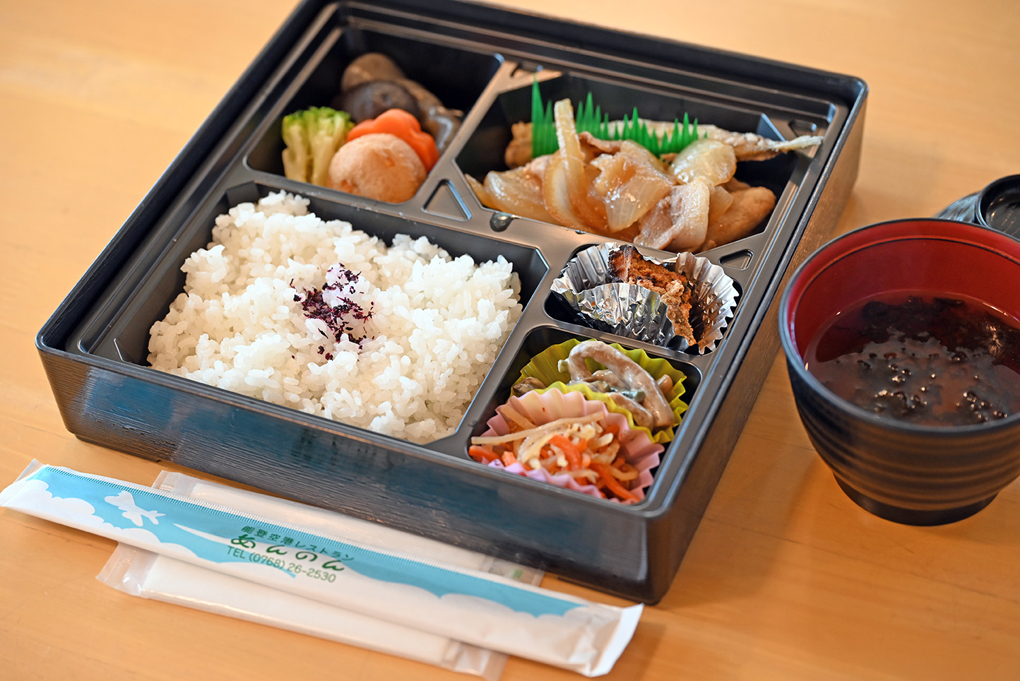 昼食はターミナルビル3階にある「レストラン あんのん」で、松花堂弁当とお味噌汁をいただきました。お弁当は豚の生姜焼き、煮物、魚のフライなど、おかずも盛りだくさん。海苔のお味噌汁は能登らしい味わいでした。