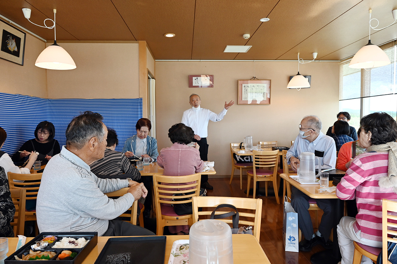 この日のメインの語り部は、地震発生時に「能登中島駅」で停車中の観光列車に乗務していたベテラン乗務員の宮下左文さん。やさしい笑顔と語りで、パワースポットの「鹿島神社」などの観光情報も盛り込みながら、地震発生から今日までのことを話してくれました。