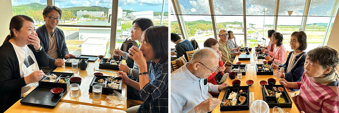 食事のときは同じテーブルを囲む初対面の参加者同士でも「発災時はどうしていましたか?」「災害ボランティアにも参加してみたい」といった会話がされていました。食事をした部屋の窓からは、災害支援ボランティア向けのベースキャンプが置かれた「日本航空学園」が見えました。