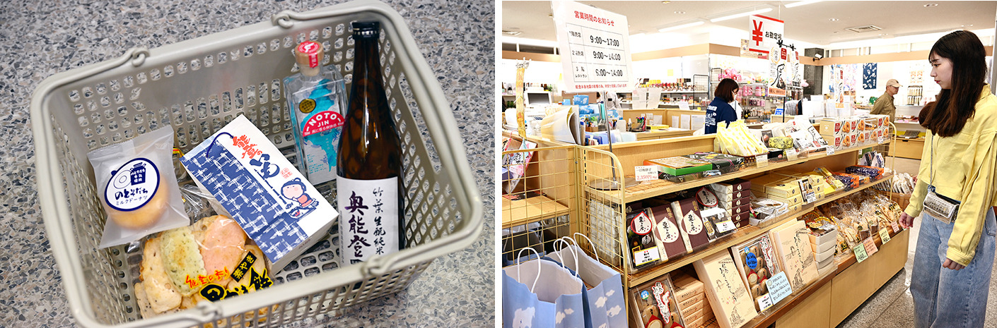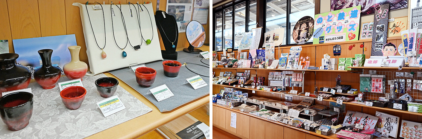 ここには能登半島の先端「奥能登」エリアを中心としたお土産品が揃い、お菓子や調味料、お酒、輪島塗のほか、のと鉄道オリジナルグッズや地元出身の力士・遠藤の関連グッズなど、ここでしか買えないお土産もあります。