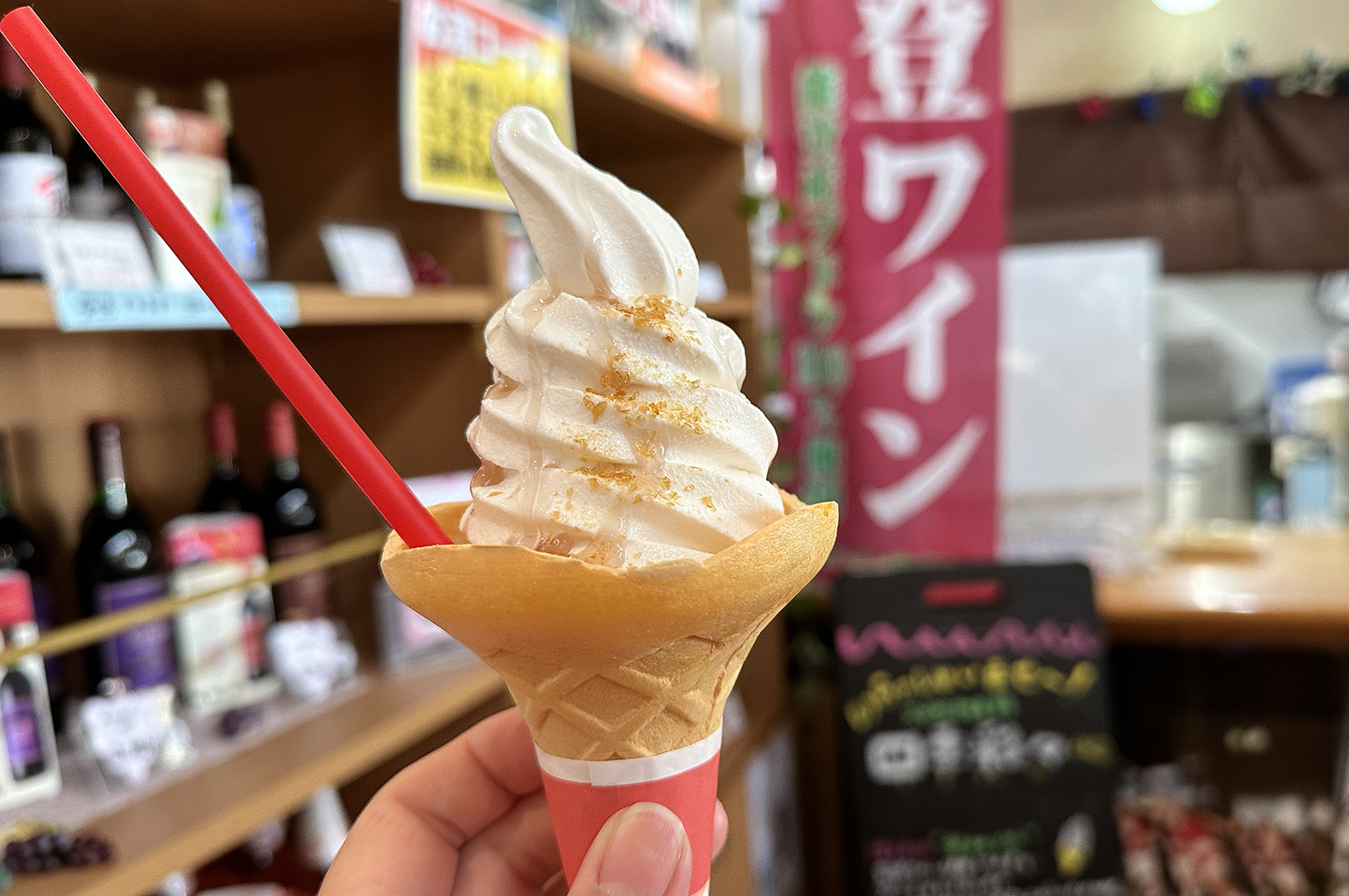 列車の出発時間まで、駅前にあるお土産店「四季彩々」に立ち寄ってお買い物をしたり、ソフトクリームやコーヒーを楽しむこともできました。朝訪れた「能登ワイン」と能登町の「横井商店」が組んで開発した「能登ワイン米飴」を使用したご当地ソフトクリームは、食感の違う米飴のシロップとザラメがソフトクリームにマッチしていました。