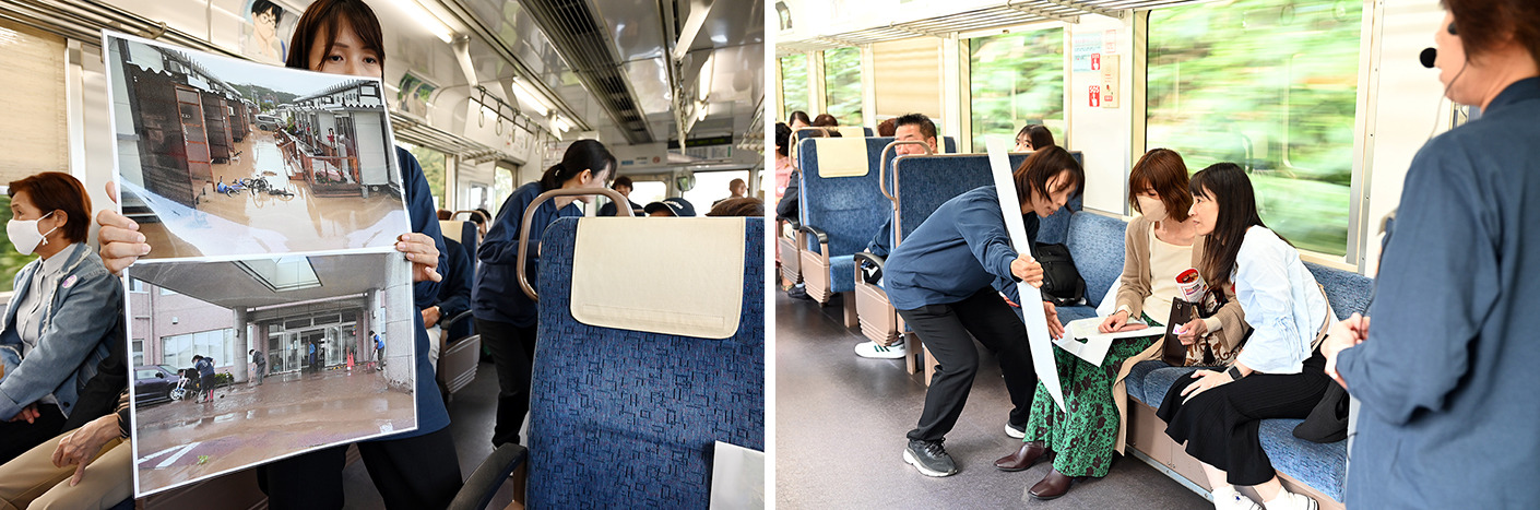 地震で崩れて埋まったトンネルのこと、沿線や能登全域の被災状況などが語られると、車内では他の語り部さんが写真パネルを持って回り説明してくれます。語りの内容や写真パネルは、常にアップデートされていて、9月21日に発生した奥能登豪雨による水害のことも紹介されました。