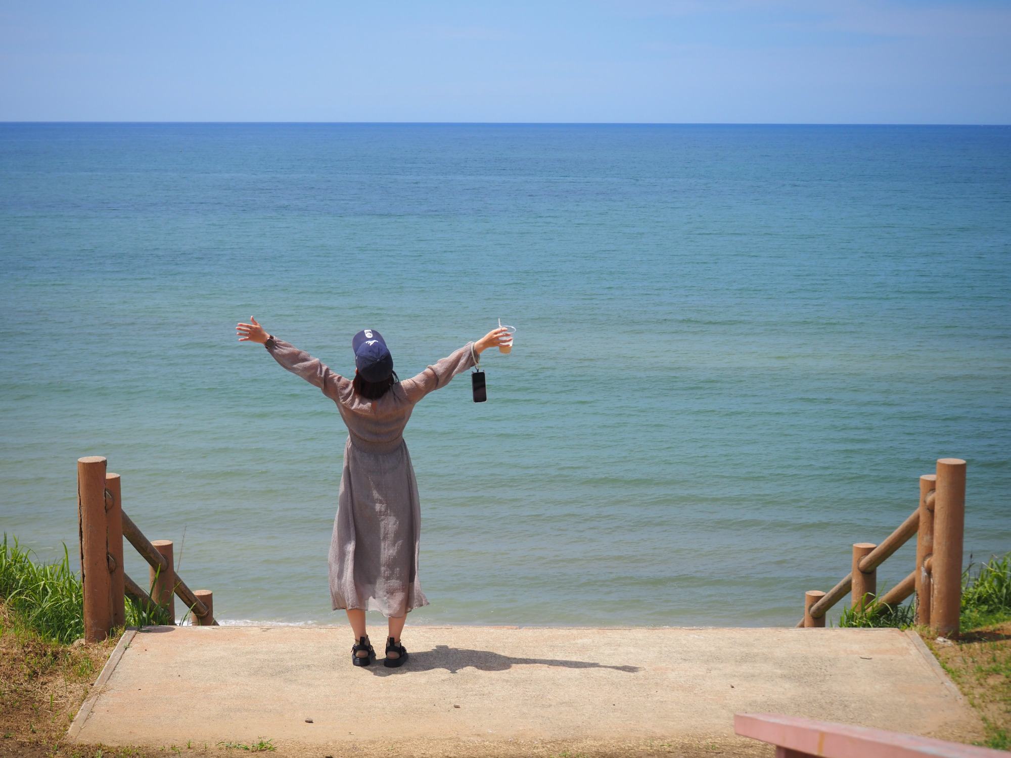 白砂の広がる海岸と、青く輝く海をバックに、記念の一枚をパシャリ。疾走感の余韻が残る中、笑顔でシャッターを切る瞬間も、旅の思い出になります。