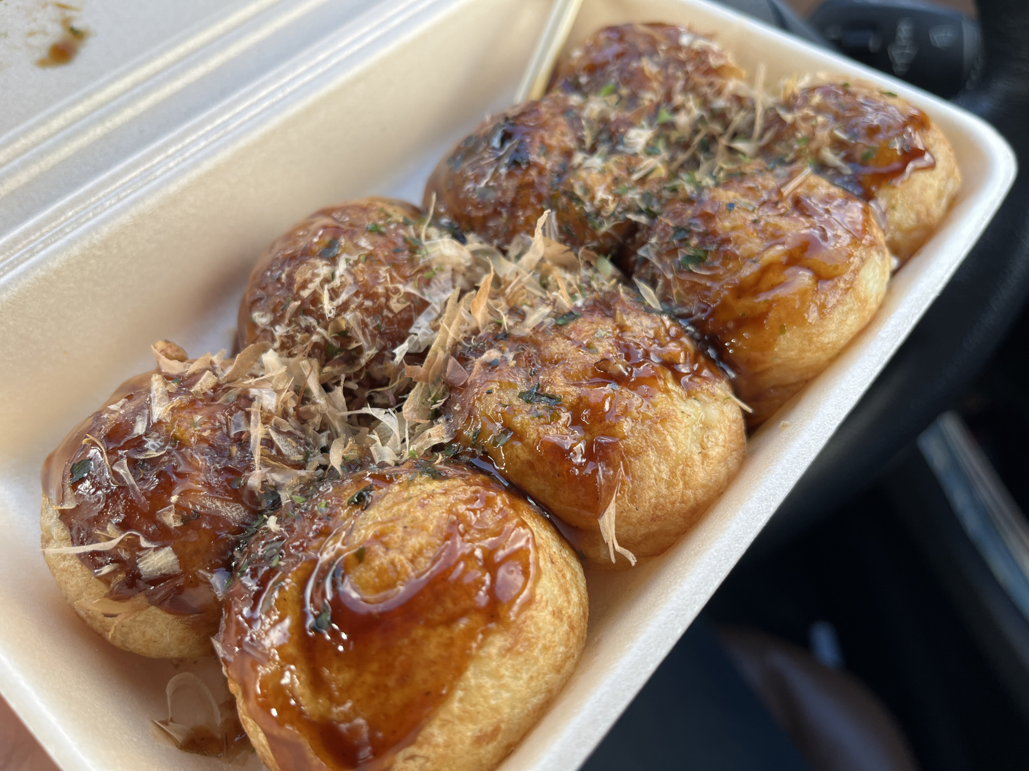 仮設店舗の中でも、道の駅に最も近い場所にある「まつ本」さんのたこ焼きは、ふわふわ&とろとろ食感がたまらない一品!