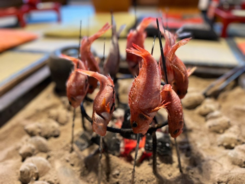 夜は、自分で釣った魚や市場で買った地魚、さらには能登牛まで、囲炉裏でじっくり焼いて乾杯。炭火の香ばしい匂いに包まれながら味わうひとときは、まさに至福です。