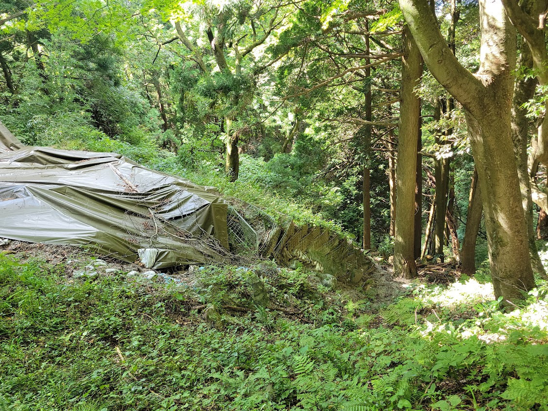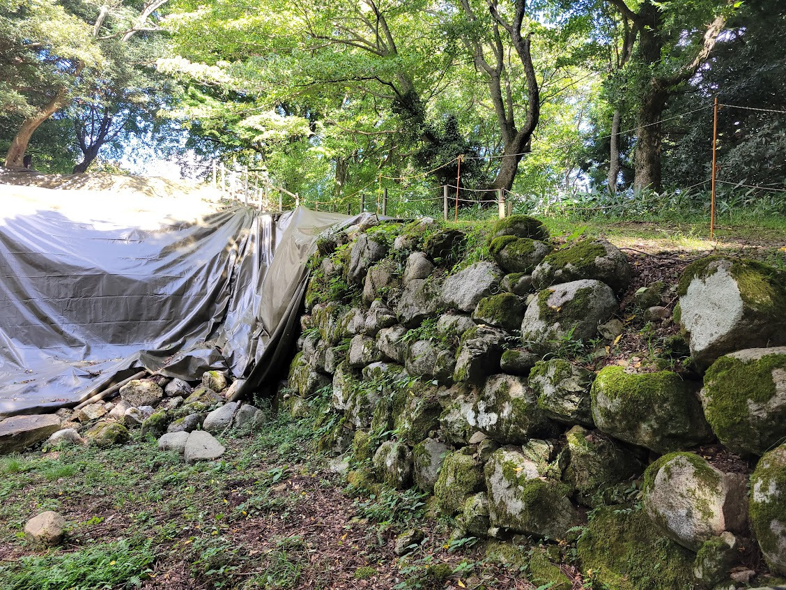 現在、崩れた石垣には、これ以上の崩壊を防ぐためのシートやネットが設置されています。