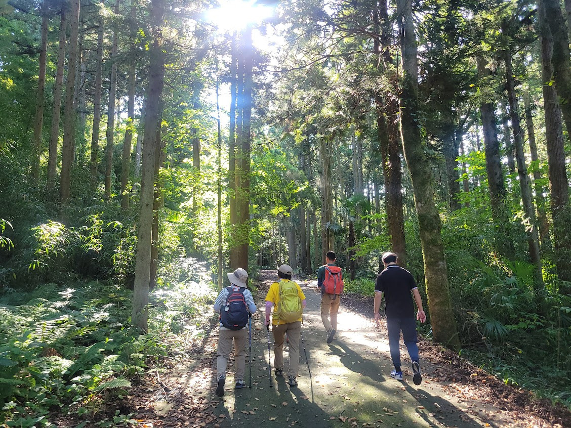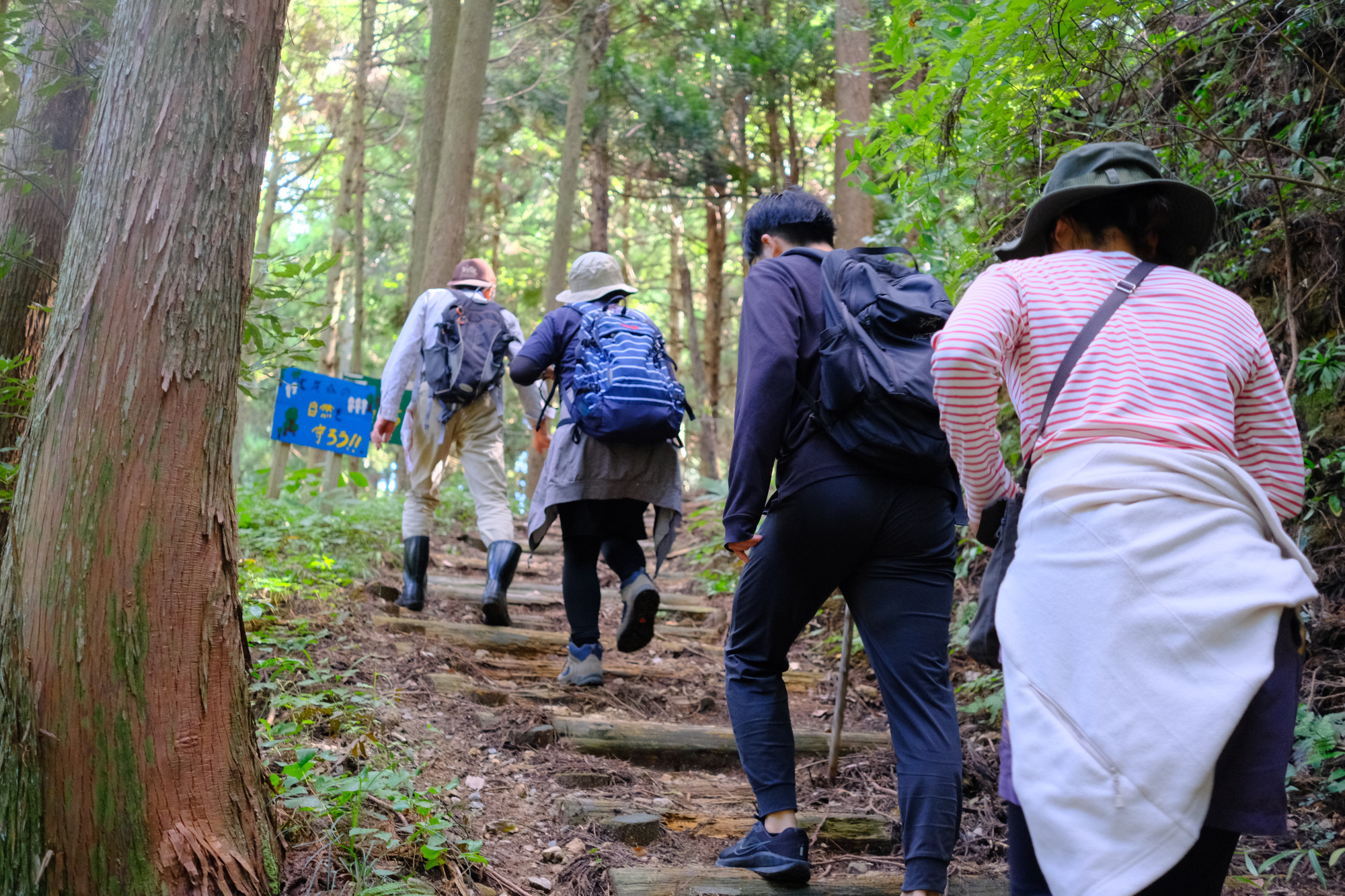 登山口駐車場からは、案内看板や道路の矢印を目印に徒歩で大手道へと進みます。山道のため登山靴がおすすめですが、天候が安定している時期であれば、履き慣れたスニーカーでも歩行可能です。