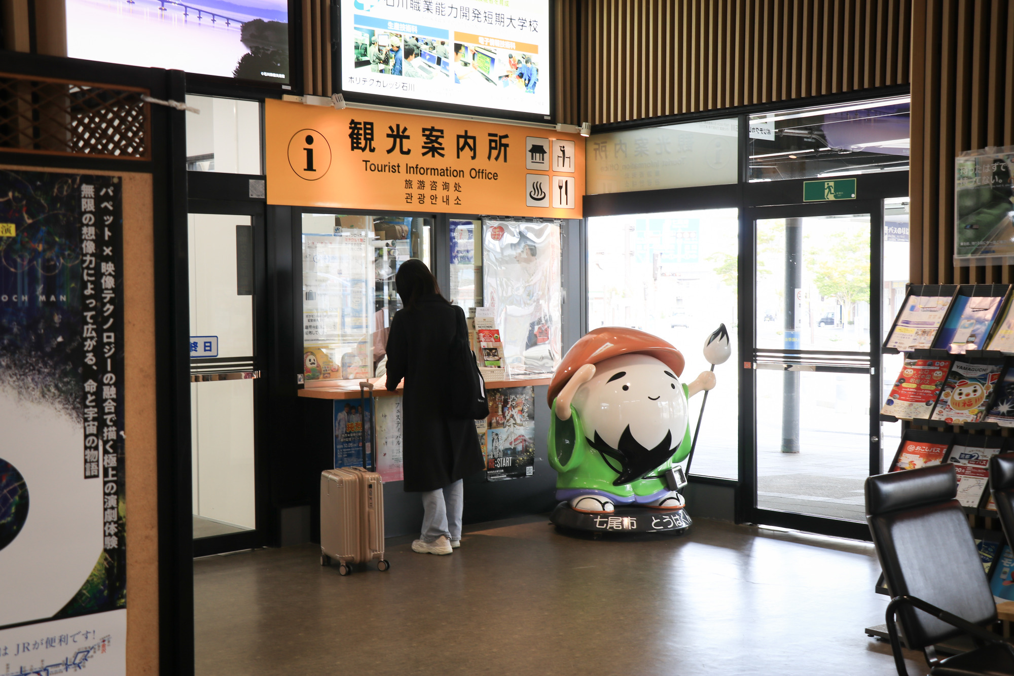 石川県・金沢駅から電車で約90分(車でも約70分)。JR七尾駅に降り立つと、長谷川等伯ゆかりの地であることを感じさせる「青雲の像」や垂れ幕が迎えてくれます。駅構内の観光案内所側には、没後400年を記念して誕生したキャラクター「とうはくん」もお出迎えしてくれます。(かつては「七尾とうはくん号」も運行されていました。)