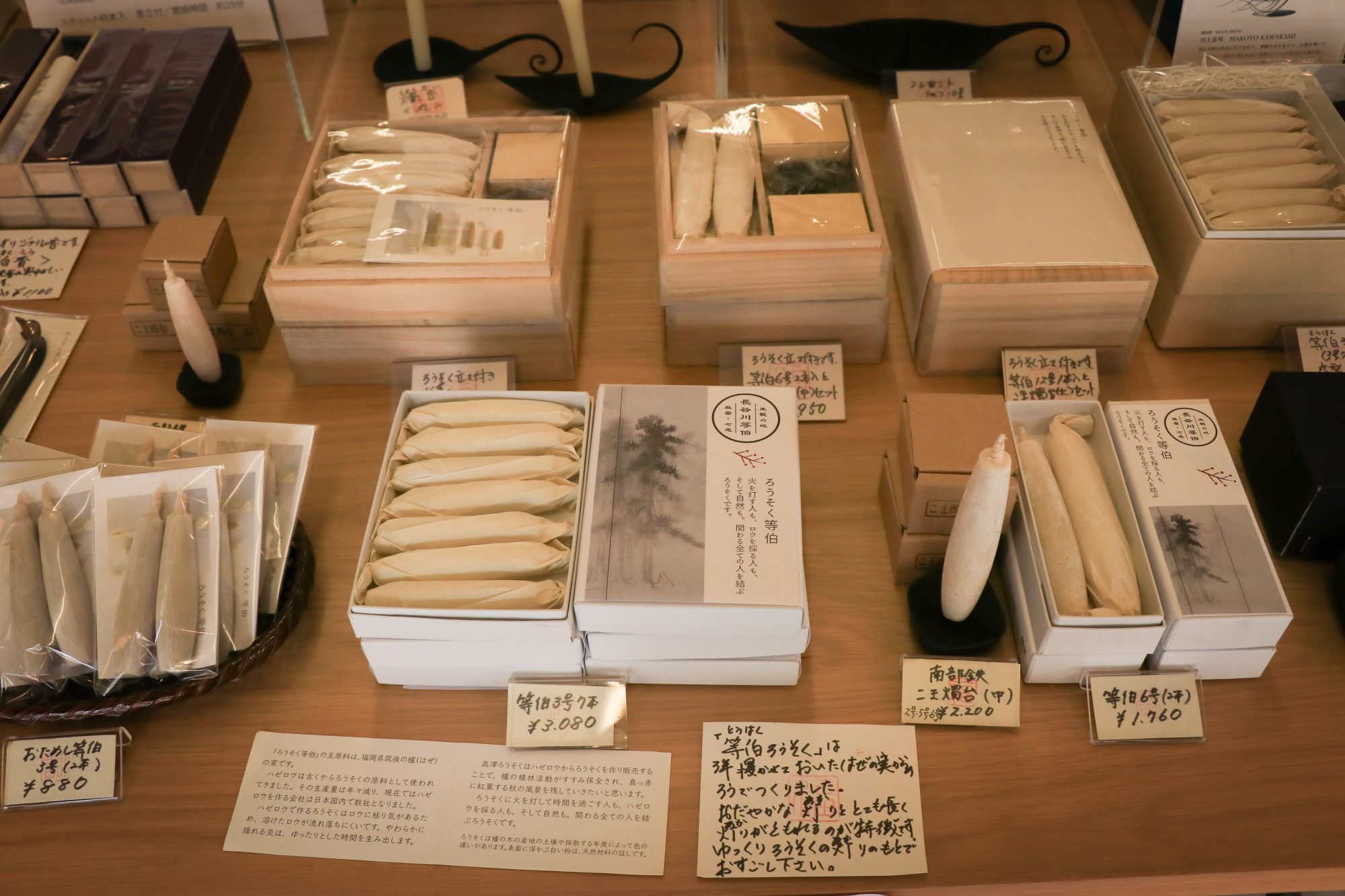 「生の明かりを楽しんでいただきたい」。その言葉が印象的だった、七尾和ろうそくを取り扱う明治25年創業の老舗ろうそく店。オーソドックスな和ろうそくのほか、菜の花やお米(米ぬか油)を主原料にしたもの、九州産のハゼロウを使用した「和ろうそく一本杉」など、さまざまな種類の和ろうそくを選ぶことができます。