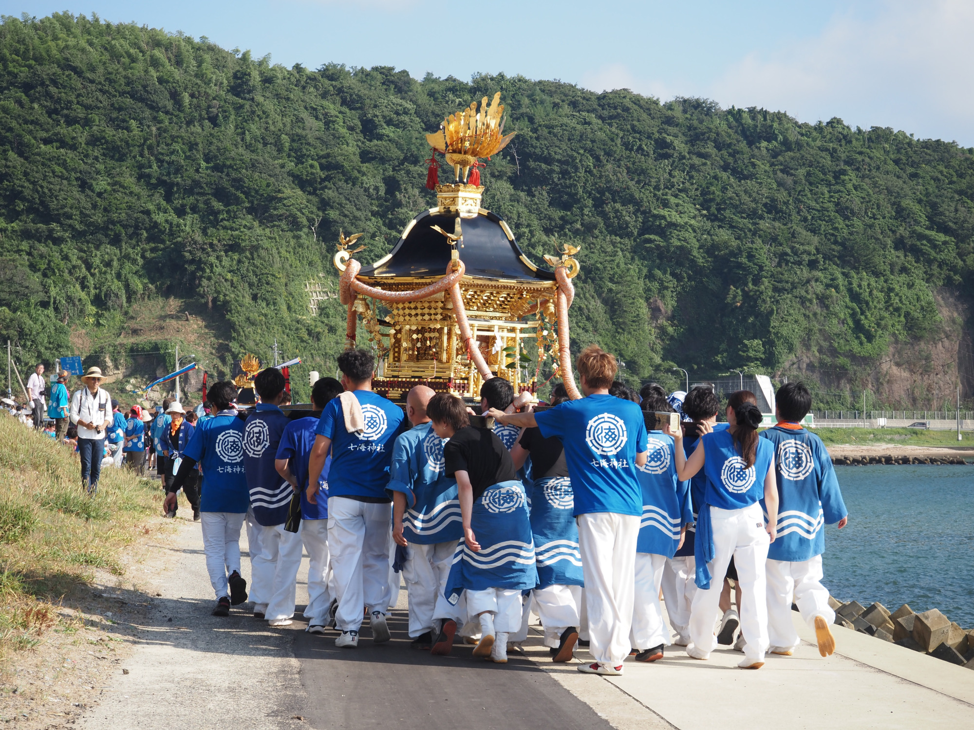 八幡神社の男神様を迎えに行き、女神様のいる住吉神社までお供するのが、この祭りの二日間です。うだるような暑さの中、海辺に並ぶ神輿の美しさがひと際目を惹きます。