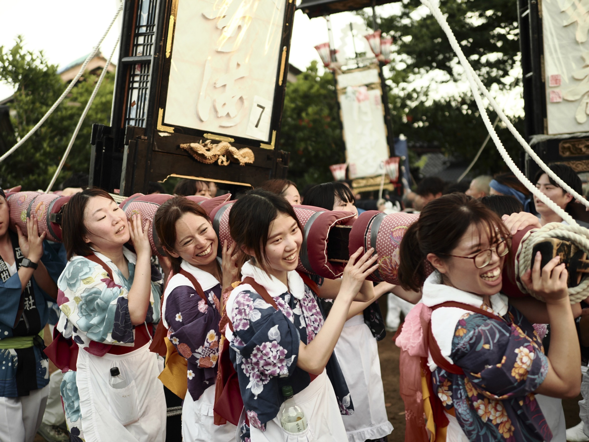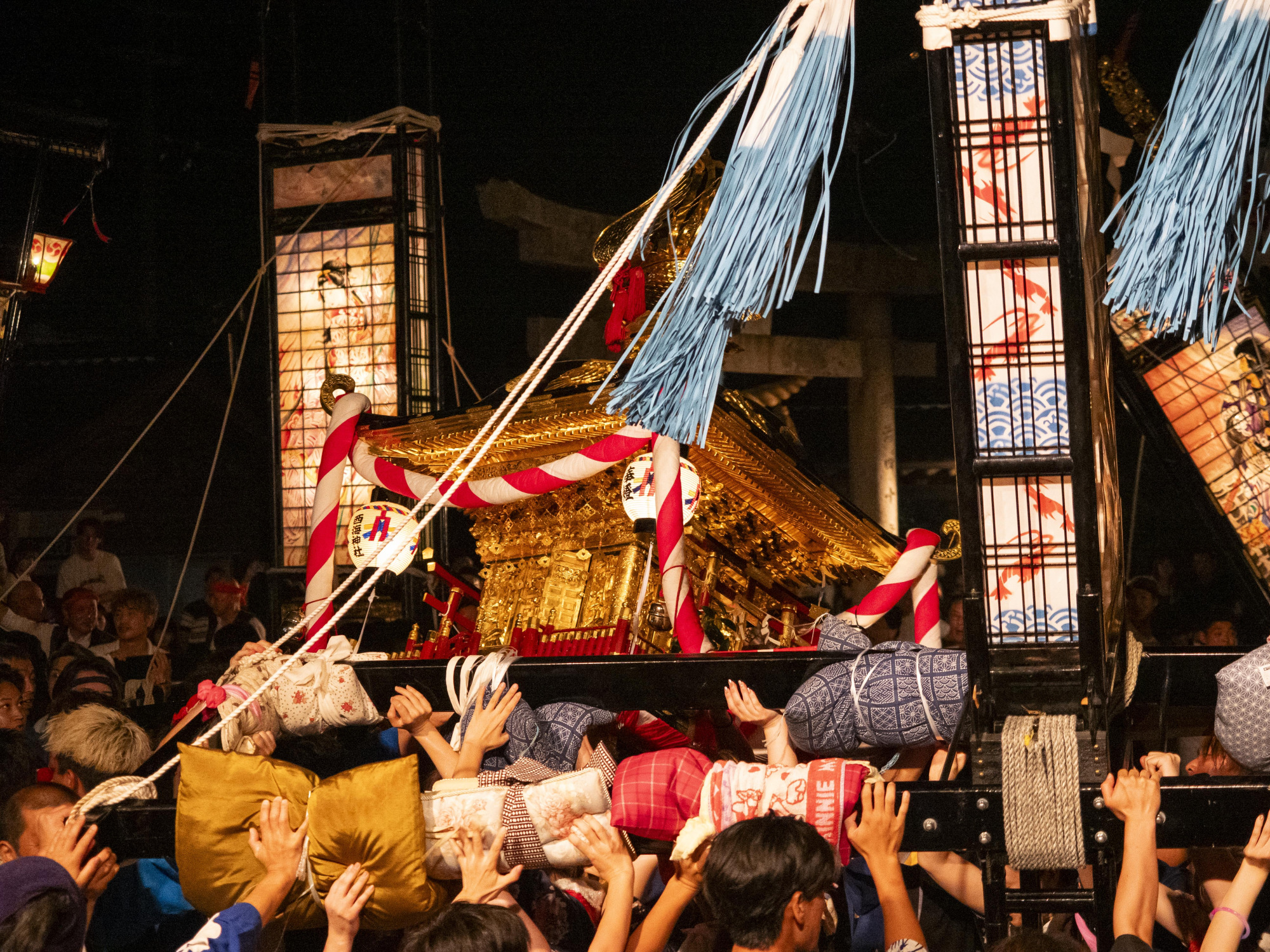 本当に満身創痍です(笑)。西海祭りは港町ならではで、豊漁を願い、祈りを込めて行われる祭礼です。西海は特に船乗りが多い集落なので、祭りの時期に男性の担ぎ手がいないことがあり、男性の代わりに女性が担ぎ手になったと言われています。