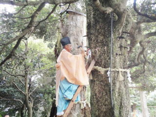 中能登町金丸の諏訪神社・藤井の住吉神社で祭典後2丁の鎌を神木(タブ)に打ち込む神事です。