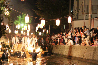2艘の舟で設えた御座舟に乗せられた神輿が、川の中で松明(たいまつ)を手にした威勢のいい若衆らとともに、上流の八幡神社までの約100メートルを行きつ戻りつしながら進む様子を大勢の観衆が見守ります。川面に浮かび上がる松明の火や船影は幻想的です。