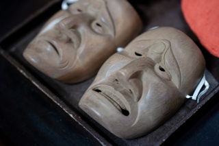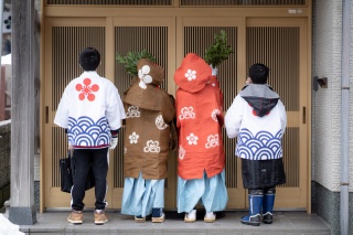 男面と女面をつけてペアを組んだ小学生が、無言で家々を回ります。