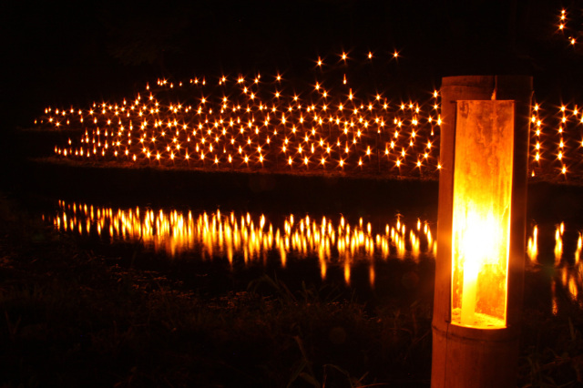 - 見竹神社を囲むように揺れる竹燈籠や飾り燈籠など、一万燈の灯りが秋の田園風景に広がります。