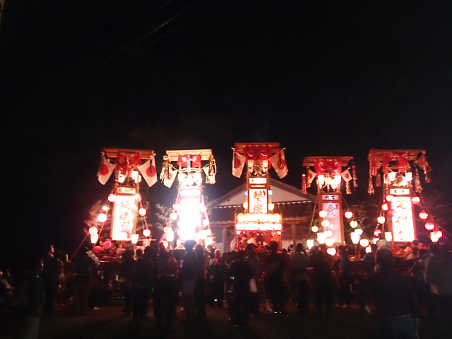 - 志賀町酒見地区の秋季祭礼です。少彦名神社から、能登富士と呼ばれる高爪山を背景に神輿が通っていく風景が見どころのひとつ。夜になると多くのキリコが出され、賑わいを見せます。