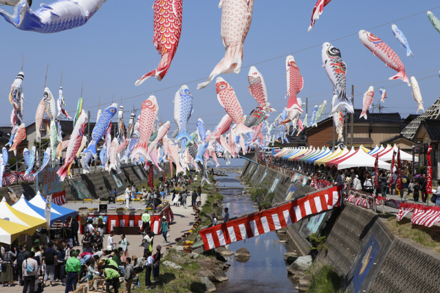 - 大谷川河口で約450本の鯉のぼりが空を泳ぎます。夜にはLEDソーラーライトを使い色鮮やかなイルミネーションが鯉のぼりを幻想的に映し出します。