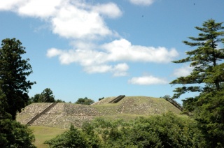 最も高い場所にある通称「雷ヶ峰」に位置する1号墳は、墳丘の長さが64メートルの前方後方墳で、県内最大規模を誇っています。墳丘は2段に築かれており、斜面は葺石(ふきいし)に覆われています。