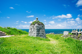 能登半島国定公園・大島海岸には、日本海のさざ波が打ち寄せる大島諸願堂の端に、石積の六角地蔵塔が物悲しくたたずんでいます。