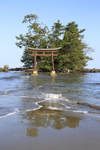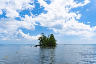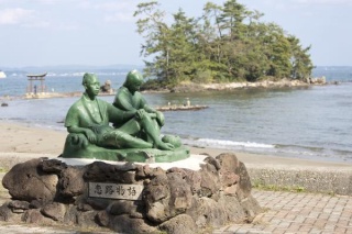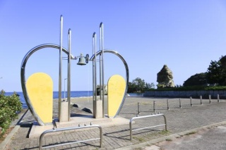 波が穏やかな恋路海岸は伝説が残る海岸です。その昔、深い恋仲となった2人の若者、鍋乃と助三郎がいました。鍋乃に思いを寄せる恋仇の男の罠のため、助三郎は海の深みにはまって命を落としてしまいました。鍋乃も助三郎の後を追って海に身を投げ死んでしまうという悲しい恋の伝説から、いつしかこの地が「恋路」と呼ばれるようになりました。この2人をしのぶモニュメントや鐘、銅像が設置されています。沖には弁天島が浮かび、恋路海岸から見附島(珠洲市)までの3.5キロの海岸線は、「えんむすビーチ」と呼ばれています。