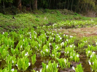 山里の風情に真っ白なミズバショウが咲き乱れます