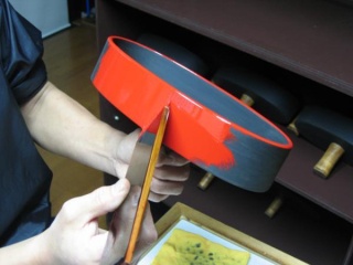 ・蒔絵:筆に漆をつけて模様を描き、漆の上に金粉を蒔きます。