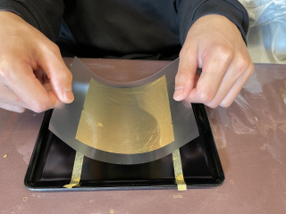 九谷五彩とよばれる赤・黄・緑・紫・紺青の5色の絵の具を使った