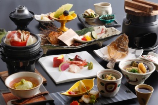 奥山中の神仙峡のほとりに建つ、ツバキを基調としたデザインの純和風旅館です。旬の食材を取り入れた月替り懐石料理に舌鼓を打ってください。