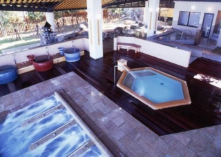 柴山潟の湖面に張り出すように造られた露天風呂「夢湯パーク」には、男女合わせて22ものお風呂がそろっています。