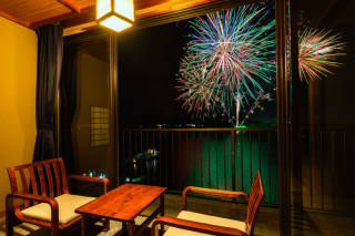 当館は片山津温泉の中心に位置し、浮御堂は真横。夏休みの期間限定花火は目の前に上がります。