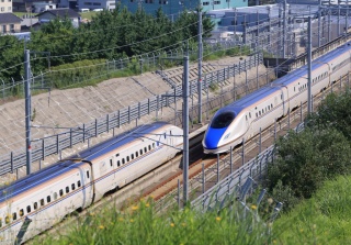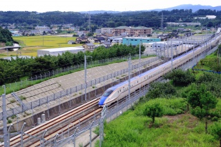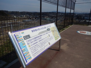 明神トンネルから杉瀬トンネル間の約1.3キロを見渡せ、最高時速260キロで走る新幹線の通過の様子を約17秒間も眺めることができる人気スポットです。展望広場にある案内看板には、北陸新幹線の通過予定時刻を掲載してあります。