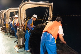 春はマダイ、アジ、マイワシ、夏はマグロ、トビウオなどを、海中に固定した網に待ち受けて獲る定置網漁は、地形や気象条件がいい富山湾で盛んに行われています。そんな富山湾に面した七尾市の鹿渡島定置では、水揚げや選別など、定置網漁の一連の流れを一年中体験できます。
