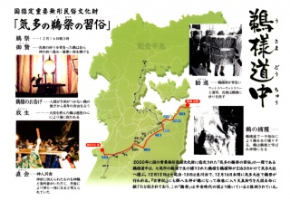 毎年12月に羽咋市の気多大社で営まれる「気多の鵜祭」国の重要無形民俗文化財に指定されており、平安時代の頃から続いています。神の化身である「鵜様」を七尾市から気多大社に運ぶ鵜様道中。鵜捕部が鵜籠を背負って、中能登町の旧道を通って羽咋市に向かいます。
