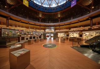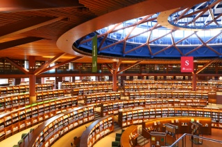 2022年に移転・開館。外壁のガラスとパネルが折り重なり、まるで本のページをめくるような外観の図書館は、4階まで吹き抜けた円形閲覧空間が内部に広がります。360°本に囲まれ、中空に浮かぶような「ブリッジ」のほか、家具デザイナー監修による500以上の閲覧席など見どころ満載。「異世界」感でも話題になっています。蔵書数も100万冊以上と豊富で、身近でなじみ深い12テーマを集めた本棚では、気軽に視覚的に本を選ぶことができます。館内にはカフェもあるほか、飲食も可能な「文化交流エリア」では知識を深めるイベントや音楽会なども多数開催。「思いもよらない本との出会いや体験によって、自分の人生の1ページをめくることができる場所」として、図書館の新たなスタイルを提案します。