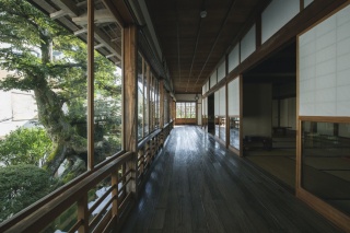 信行寺にある御便殿は、随行員の控室であった供奉殿の部分であり、今は信行寺書院となっています。もともと御便殿は本殿(御座所)と供奉殿が一体となっていましたが、昭和35年に供奉殿を信行寺へ移築しました。廊下の「うづくり(浮造)」と呼ばれる処理を施した床板が見どころです。