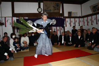 袴姿の舞人と参拝者が、ともに独特の節回しで「万歳楽土」と唱え、豊作を祈願します。