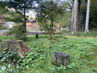 川沿いにはちょっとした広場もあるので、切り株を自然のテーブルやイス代わりにして外でいただくこともできます。