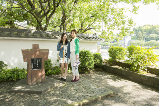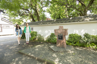 金沢の三文豪の1人・室生犀星は犀川をこよなく愛しました。犀川大橋を上流へ向うと、流し雛を型どった赤御影石の犀星詩碑があります。春にはその頭上をあんずの花で飾る犀星自筆の碑面には「小景異情」の一節あんずの詩が刻まれています。