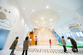 そんな白山市に誕生したトレインパーク白山は、北陸新幹線の白山総合車両所に隣接し、加賀笠間駅からシャトルバスで約5分。5階まである建物は、テーマごとにフロアが分かれており、大人から子どもまで楽しめる全天候型の屋内展示体験施設です。