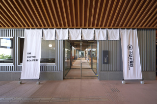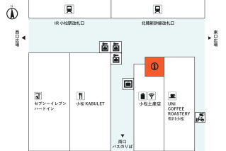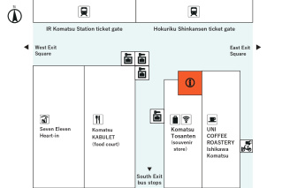 北陸新幹線小松駅の改札を出たら、白い暖簾がお出迎え。Komatsu九のスーベニア&カフェエリアの入口に、観光案内所があります。